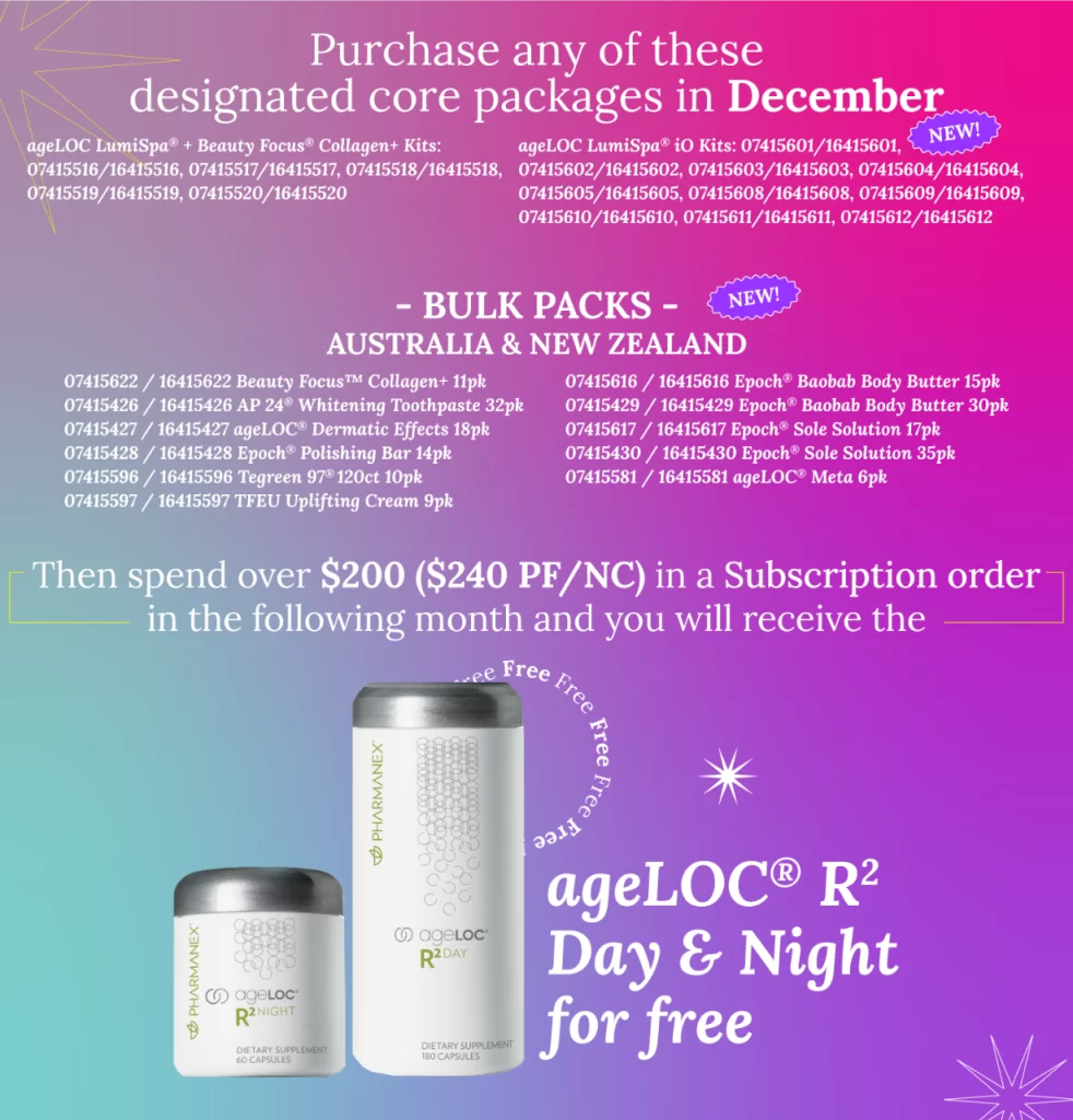 AU NZ PF NC ageLOC Spa Beauty Pack BUY BUY BUY BUY ageLOC Boost System BUY BUY BUY BUY ageLOC Body Spa Package BUY BUY BUY BUY ageLOC Me Skin Care System BUY BUY BUY BUY Pharmanex Favourites Pack BUY BUY BUY BUY ageLOC LumiSpa Kit & Collagen+ Pack BUY BUY BUY BUY ageLOC LumiSpa iO Kit BUY BUY BUY BUY Beauty Collagen+ 11pk BUY BUY BUY BUY AP 24 Whitening Toothpaste 32pk BUY BUY BUY BUY ageLOC Dermatic Effects 18pk BUY BUY N/A N/A EPOCH Polishing Bar 14pk BUY BUY BUY BUY Tru Face Essence Ultra Uplifting Cream 9pk BUY BUY BUY BUY Tegreen 120 counts 10pk BUY BUY BUY BUY Essentials Package BUY BUY N/A N/A Then spend over $200 ($240 PF/NC) in a Subscription order in the following month and you will receive the Winter Pamper Pack for free.